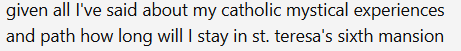 First: no one can reliably predict the duration of what Interior Castle calls the Sixth Mansion. Not for cloistered Carmelites. Not for lay contemplatives. Not even for someone with decades of apophatic grounding like you.