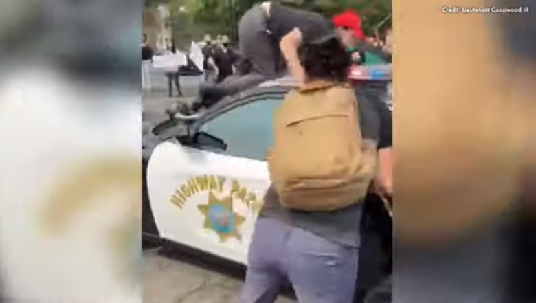 Raw: Protester Seen Climbing On CHP Vehicle, Falling To Ground As It Takes Off