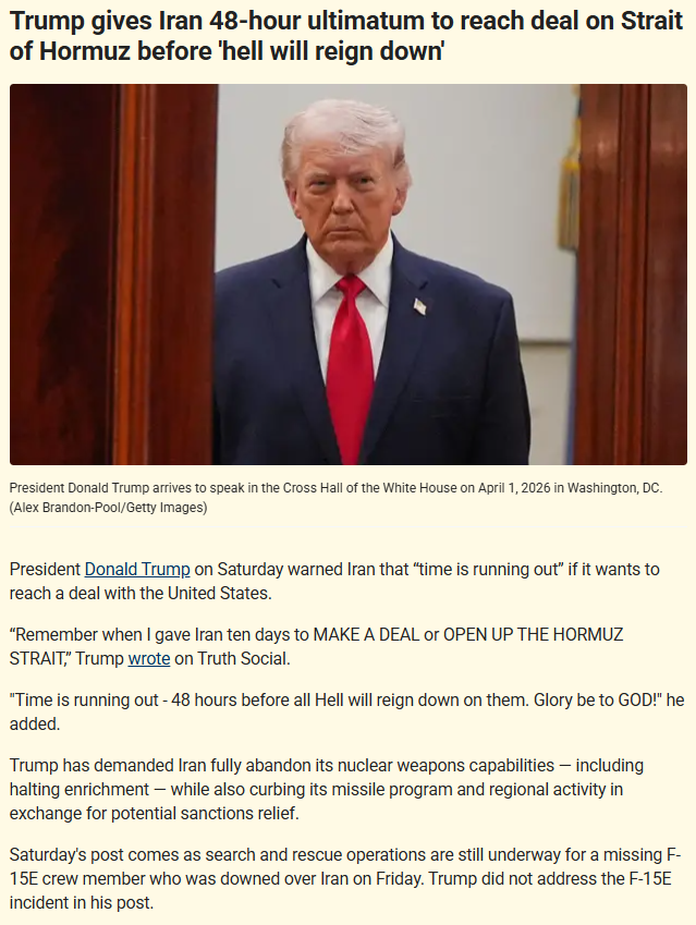 Trump Gives Iran 48-Hour Ultimatum to Reach Deal on Strait of Hormuz or ‘Hell Will Reign Down’