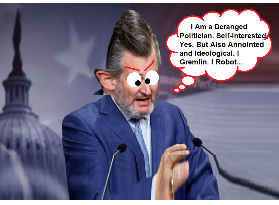 Note: For maximum effect play both videos below at the same time: it add a nice touch of absurdity; it highlights the moral insanity of Ted Cruz. You may need to adjust the video volumes to match…